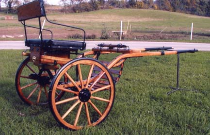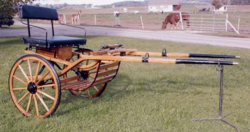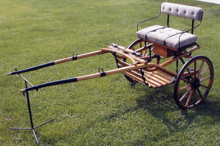 A cut above the “Show Pleasure” or “Easy Entry” carts in styling and incorporates a different spring system. Half elliptic attached crossways instead of 1 on each side which rides as well as a flexishaft Meadowbrook. No heavier duty springs needed for animals greater than 38″ to 44″. Seat deeper than our other two wheeled carts, but not as wide (28” long and 14” deep). Comes standard with Stationary seat that doesn’t fold down but has 4 adjustable settings, Carriage sits on a sliding track. You lift the seat about a half inch, then it slides. Although the cart is a little fancier than our other models, it is sturdy enough for everyday use on the trails and roads.