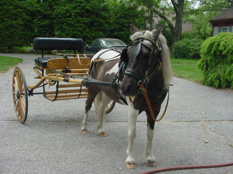 The Spares box is standard (inside measurement is 11″ deep x 8″ wide x 4″ high). Double bend shaft dip lower than standard shafts. It is a bit higher than our Show Pleasure or Meadowbrook cart so it takes a smaller wheel. Floor slats end around the axle. Can’t add fenders, folding or split seat – meant to be a side entry cart. Mini thru small pony size weighs ~112 lbs before options.