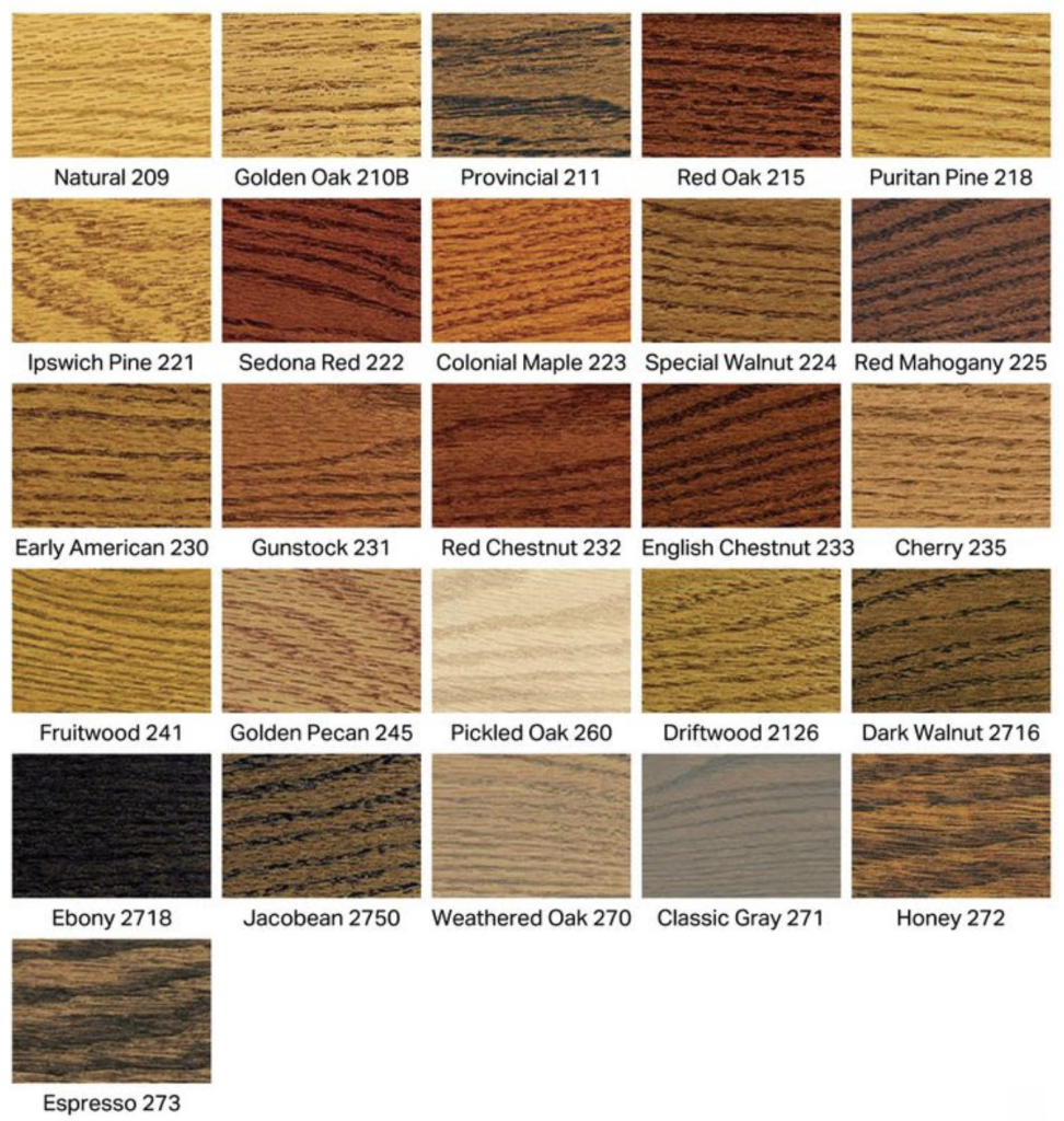 - I use Minwax stains (see chart below). You can choose any color except EBONY. The most popular is Early American or Golden Oak. We apply a spar varnish over the stain. The finished color will appear lighter and yellower than the samples below. The delivery time will vary with the carriage selected.
